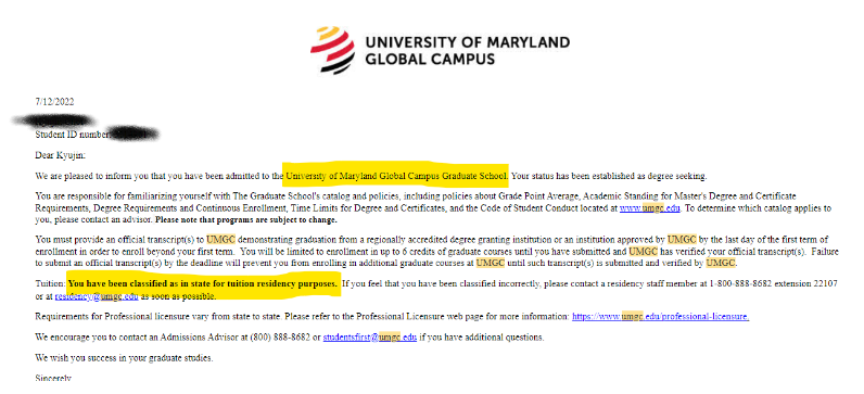 성적표를 제출하고 난 후에, 학교로부터 정식 입학 허가서를 받았다. 나는 메릴랜드 거주자로 in-state tuition (대학과 같은 주에 거주하는 사람들에게 해당하는 학비)로 분류되었다는 내용도 입학 허가서에는 적혀 있었다. 오랜만에 학번을 받고, 학교 이메일 (edu)을 받으니 마음이 설레기도 하였다.